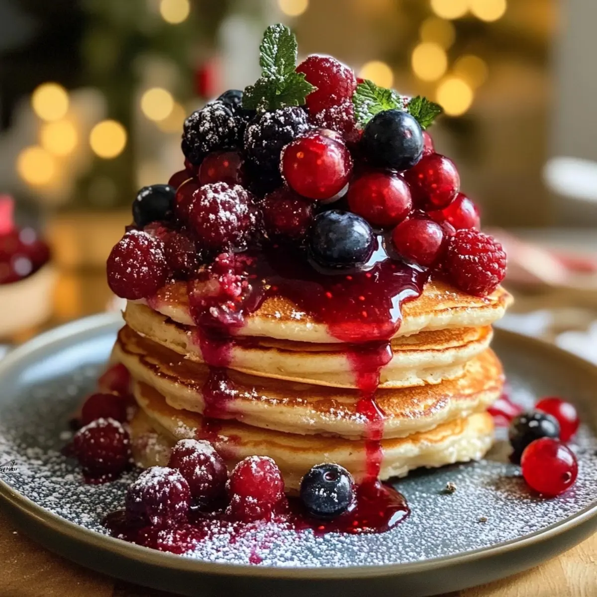 Assemble the stack: Layer the fluffy pancakes on a serving plate. Generously top with the warm berry compote and garnish with fresh mint leaves for an extra festive touch.